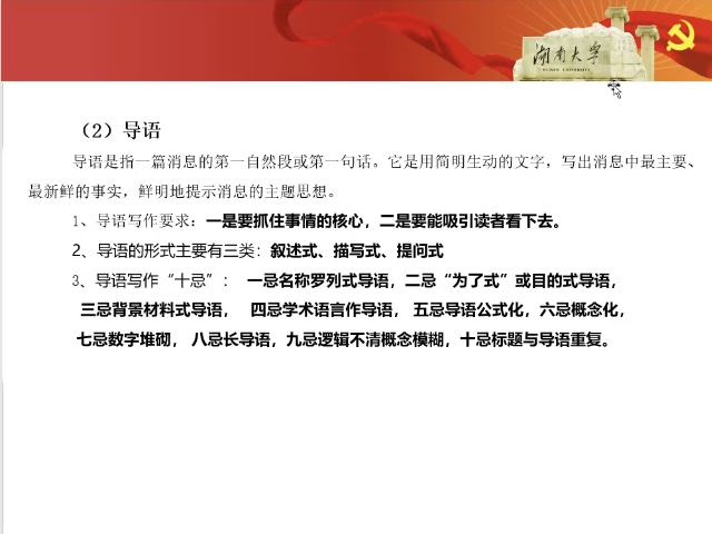 导语方面,马老师提出导语写作十忌。他指出,导语写作一定要注重抓住事件重点,并吸引人继续看下去。