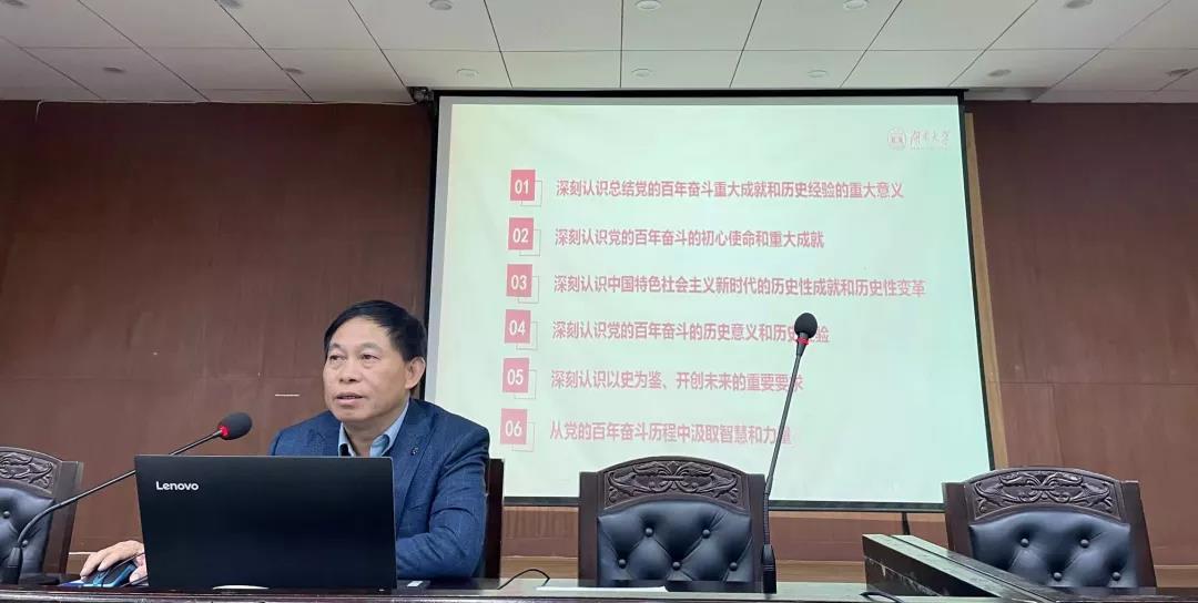 易骆之从深刻认识总结党的百年奋斗重大成就和历史经验的重大意义、深刻认识党的百年奋斗的初心使命和重大成就、深刻认识中国特色社会主义新时代的历史性成就和历史性变革、深刻认识党的百年奋斗的历史意义和历史经验、深刻认识以史为鉴、开创未来的重要要求、从党的百年奋斗历程中汲取智慧和力量六个方面为参会师生进行了详细解读。