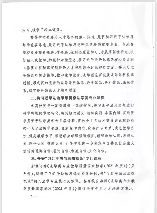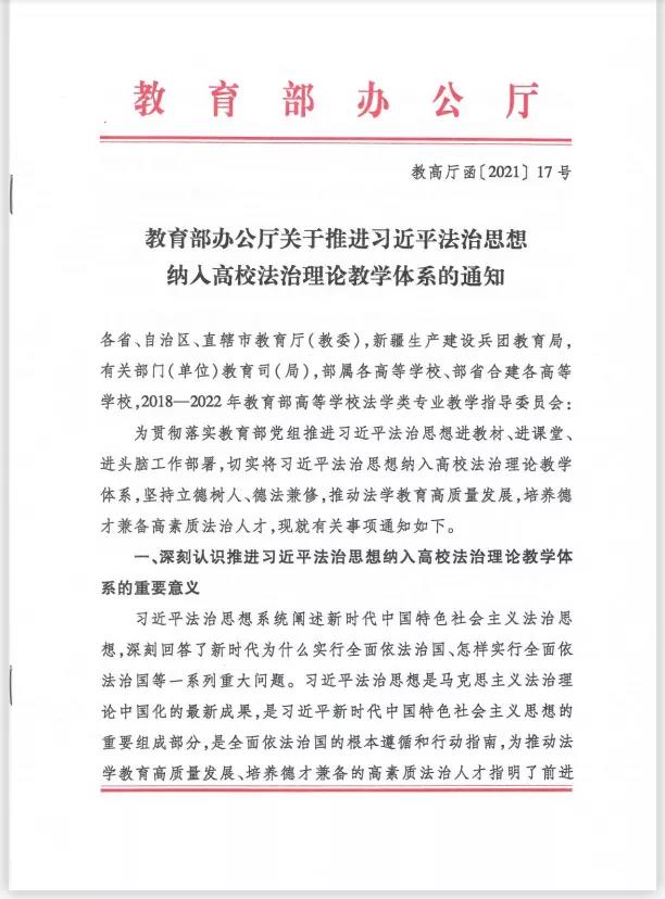 为贯彻落实教育部党组推进习近平法治思想进教材、进课堂、进头脑工作部署,切实将习近平法治思想纳入高校法治理论教学体系,坚持立德树人、德法兼修,推动法学教育高质量发展,培养德才兼备高素质法治人才,现就有关事项通知如下。