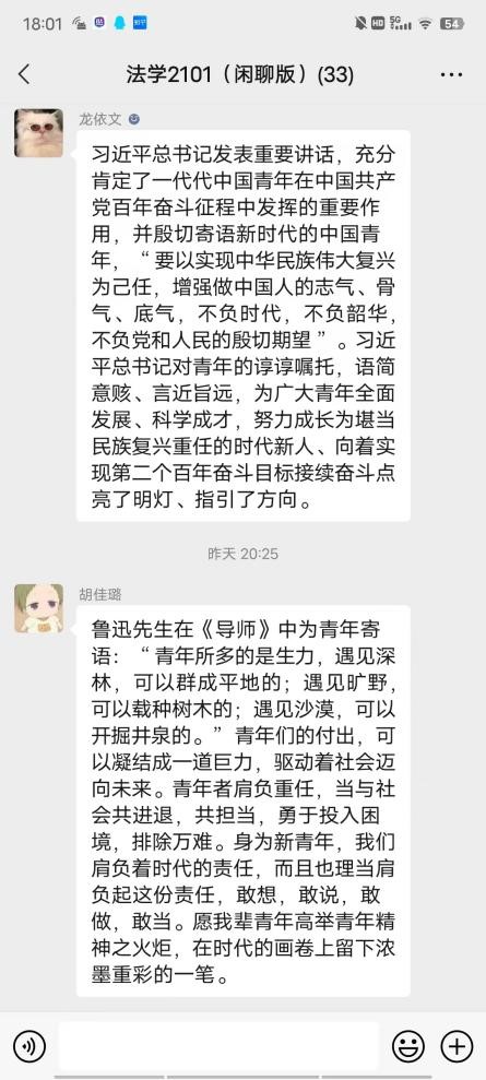 最后程明锦同学也表达了自己的感想:“青春向党,不负人民。学习了习近平总书记在中国人民大学的重要讲话,我深有感悟。身为新时代青年,我们要坚定指导思想,重视思政课程,学好马克思主义,毛泽东思想等一系列重要理论,学会用哲学方式思考问题。同时,还要学好中国历史,了解中国文化,讲好中国故事。另外,作为一名法学生,要认真对待专业知识,努力钻研法律问题,去维护社会的公平正义,助力建设社会主义法治国家目标的实现。”