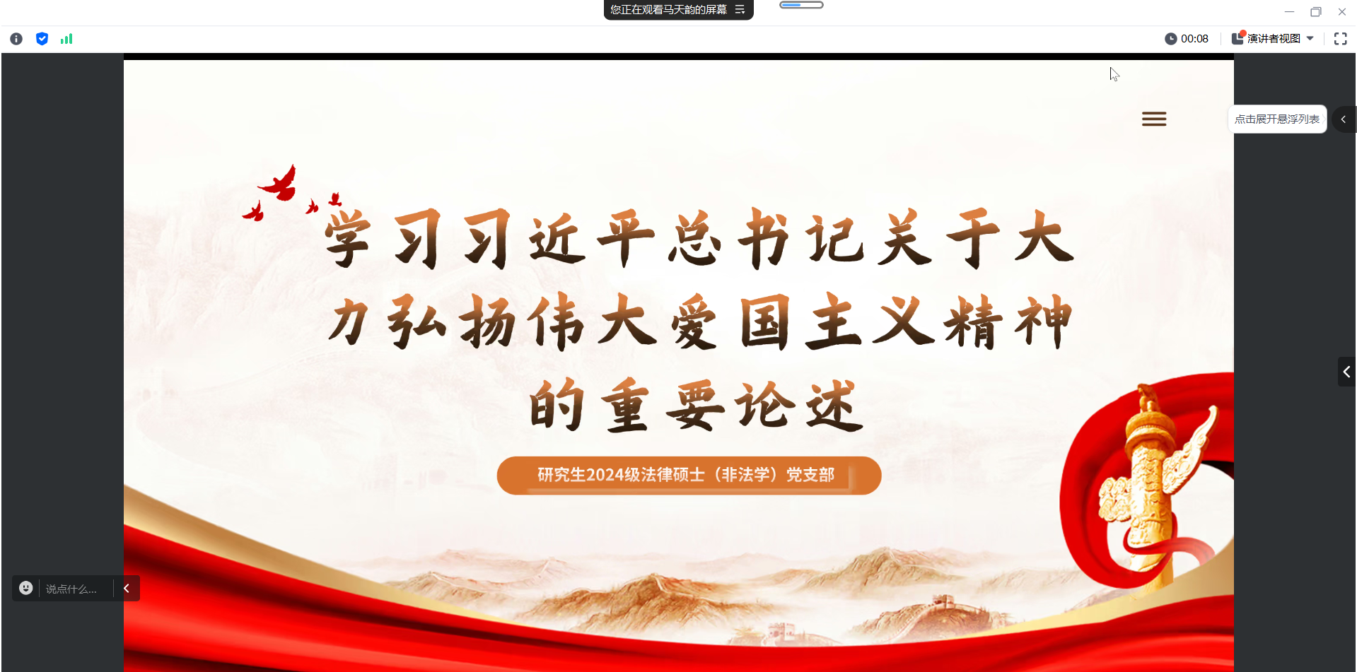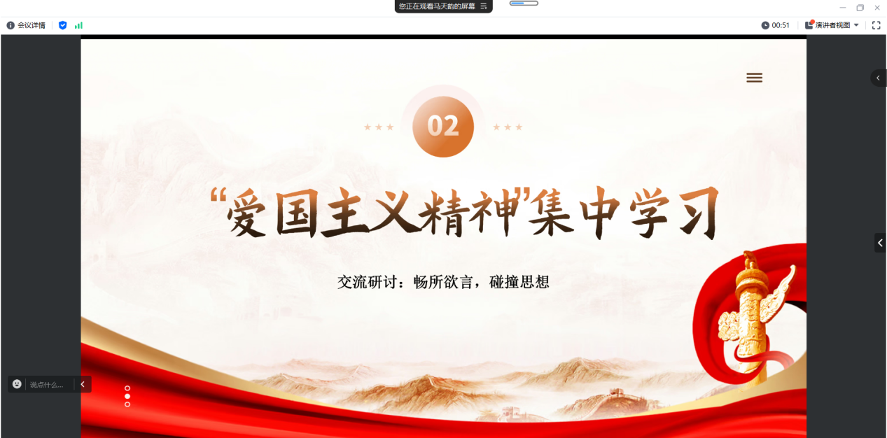 为深入学习习近平总书记关于弘扬伟大爱国主义精神的重要论述,研究生2024级法律硕士(非法学)党支部于2024年10月21日通过线上会议的形式,举行了“学习习近平总书记关于大力弘扬伟大爱国主义精神的重要论述”主题党日活动,全体党员围绕《大力弘扬伟大爱国主义精神,把强国建设、民族复兴伟业不断推向前进》展开深入研讨和交流。会议旨在引导学生党员深刻理解和领会爱国主义的时代价值,增强爱国情怀,提升责任感和使命感。支部全体党员参加本次活动,活动由党支部书记马天韵主持。