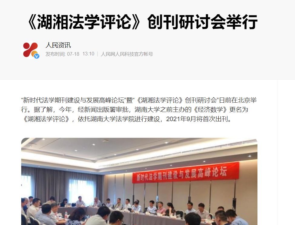 会议的成功召开和《湖湘法学评论》的创刊引发了媒体的高度关注及广泛报道。截止到发稿时为止,已有《光明日报》、人民网-人民资讯、中国新闻网、法治日报—法制网、检察日报-正义网、《法治周末报》、《三湘都市报》、红网、《长沙晚报》为此推出报道。