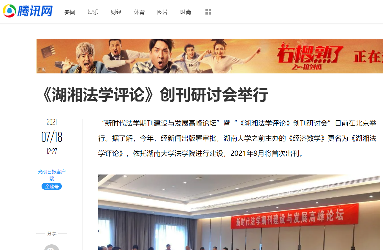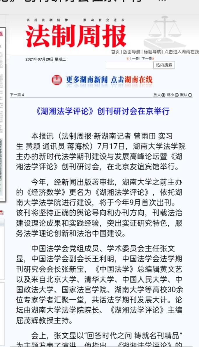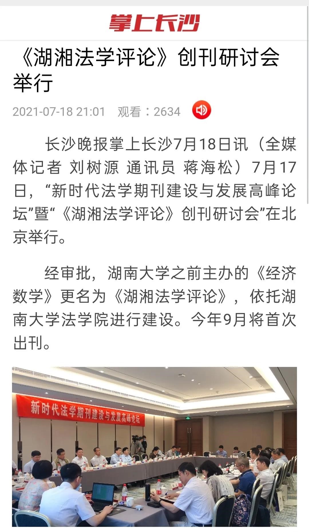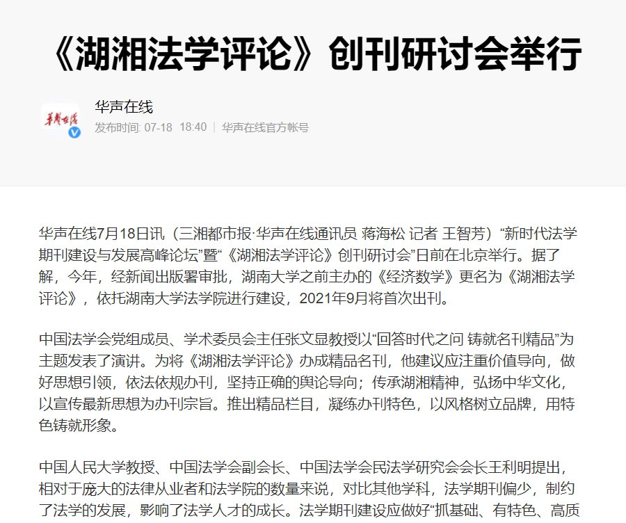 主办的“新时代法学期刊建设与发展高峰论坛”暨“《湖湘法学评论》创刊研讨会”在北京友谊宾馆举行。《湖湘法学评论》的成功创刊及研讨会的成功举办引发媒体密集报道。目前,已有《光明日报》、人民网-人民资讯、中国新闻网、法治日报—法制网、检察日报-正义网、《法治周末报》、凤凰网、《法制周报》、新湖南客户端、《三湘都市报》、红网、《长沙晚报》、腾讯网、华声在线等为此推出报道,《中国法学》杂志社公众号、教授加、法学学术前沿、法科生之家、法研在线等知名法律界公号推出了详细报道。
