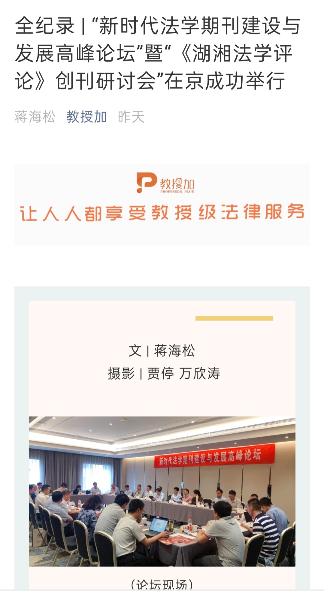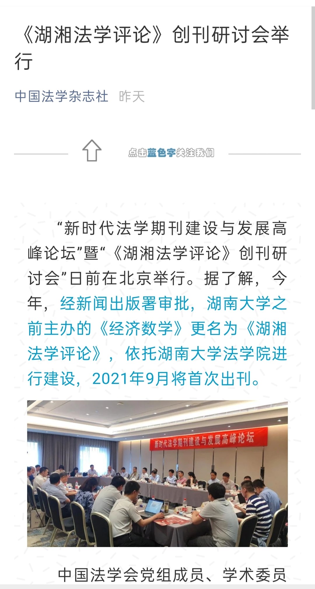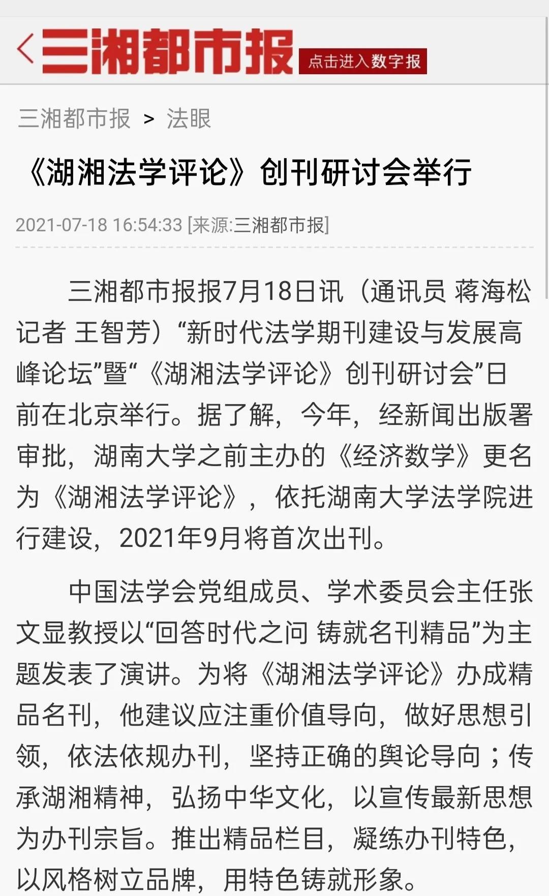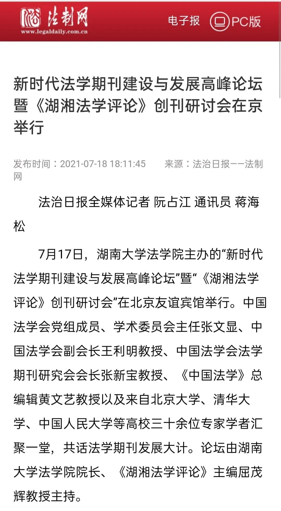 主办的“新时代法学期刊建设与发展高峰论坛”暨“《湖湘法学评论》创刊研讨会”在北京友谊宾馆举行。《湖湘法学评论》的成功创刊及研讨会的成功举办引发媒体密集报道。目前,已有《光明日报》、人民网-人民资讯、中国新闻网、法治日报—法制网、检察日报-正义网、《法治周末报》、凤凰网、《法制周报》、新湖南客户端、《三湘都市报》、红网、《长沙晚报》、腾讯网、华声在线等为此推出报道,《中国法学》杂志社公众号、教授加、法学学术前沿、法科生之家、法研在线等知名法律界公号推出了详细报道。